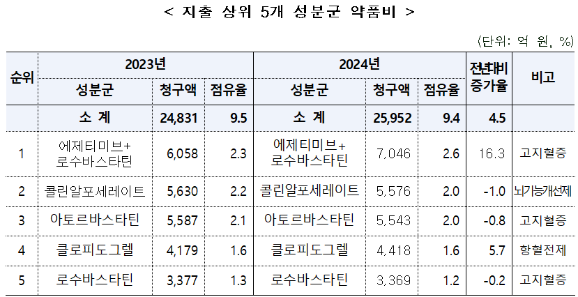 성분별 지출은 에제티미브+로수바스타틴이 전년 대비 16.3% 상승하며 청구액 7046억원으로 집계됐다.