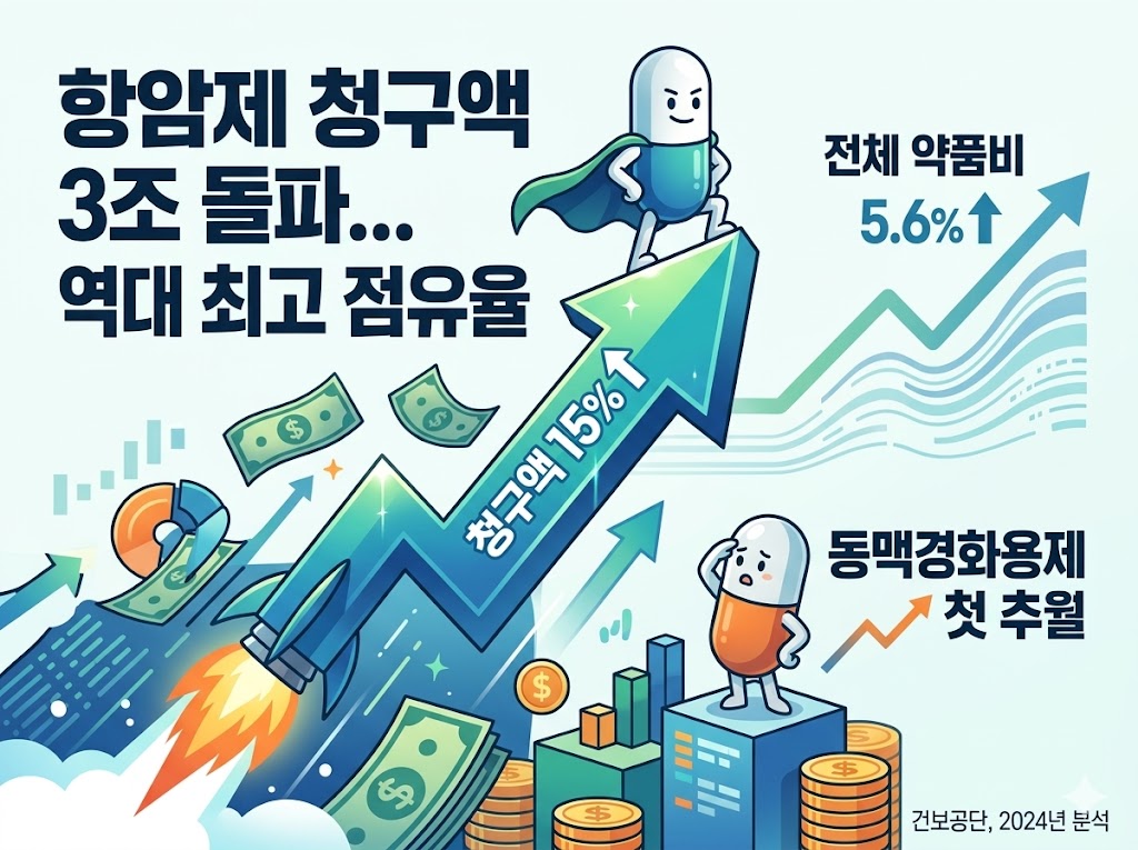 전체 약품비가 5.6% 증가하는 동안 항암제 청구액은 15% 상승했다. 지출 상위 5개 효능군 중 압도적인 증가율을 보였다.