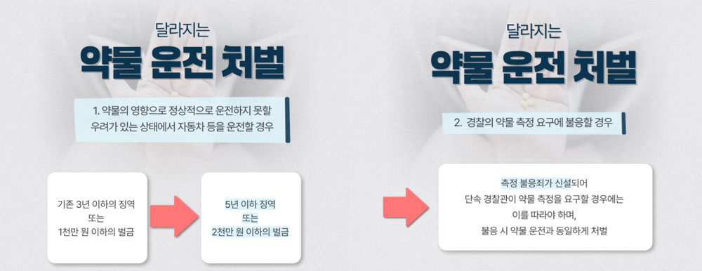 기존 3년 이하의 징역 또는 1000만원 이하의 벌금에서 '5년 이하 징역 또는 2000만원 이하의 벌금'으로 약물운전 처벌이 상향되고, 측정 불응죄 역시 약물운전과 동일하게 처벌받게 된다는 내용이 핵심입니다.