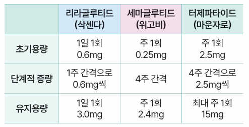 한편 GLP-1 계열 약물은 리라글루티드(Liraglutide; 삭센다), 세마글루티드(Semaglutide; 위고비), 터제파타이드 (Tirzepatide; 마운자로)가 대표적이다.