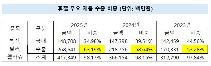수출 비중 확대도 수익성 개선을 뒷받침했다. 미국과 중국 등 고단가 시장 중심으로 수출이 늘면서 전체 매출 대비 수출 비중은 2023년 53.28%에서 2024년 58.64%, 2025년 63.19%까지 상승했다.