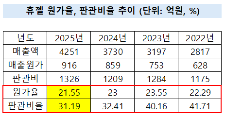 판관비율 역시 개선 흐름을 이어가고 있다. 지난해 판관비율은 31.19%로 전년(32.41%) 대비 1%포인트 이상 낮아졌으며, 2022년과 비교하면 3년 만에 10%포인트 이상 감소했다.