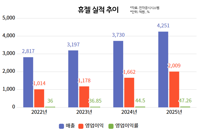 지난달 휴젤은 연결 기준 2025년 매출 4251억원, 영업이익 2016억원, 순이익 1440억원을 기록했다고 공시했다. 전년 대비 매출은 14%, 영업이익은 21.3% 증가하며 역대 최대 실적을 경신했다.