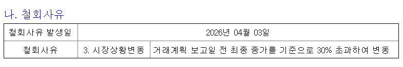 6일 공시에 따르면 전인석 대표의 특정증권등 거래계획은 ‘시장상황변동’을 사유로 철회됐다. 거래계획 보고일 전 최종 종가 대비 주가가 30%를 초과해 변동하면서 계획 유지 요건을 충족하지 못했다.