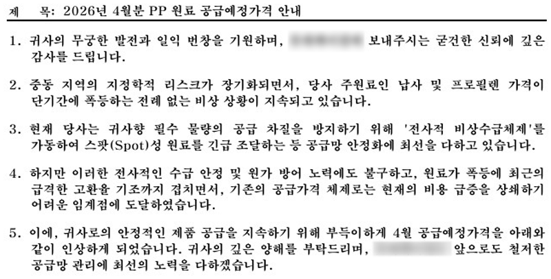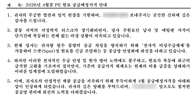 소모품 생산·유통 업체가 수신한 PE·PP 원료 공급가격 인상 관련 공문에서 "중동 지역의 지정학적 리스크가 장기화되면서, 에틸렌과 납사 가격이 단기간 폭등하는 전례없는 비상 상황이 지속되고 있다"며 "부득이 4월 공급가격을 인상하게 됐다"고 밝혔다.