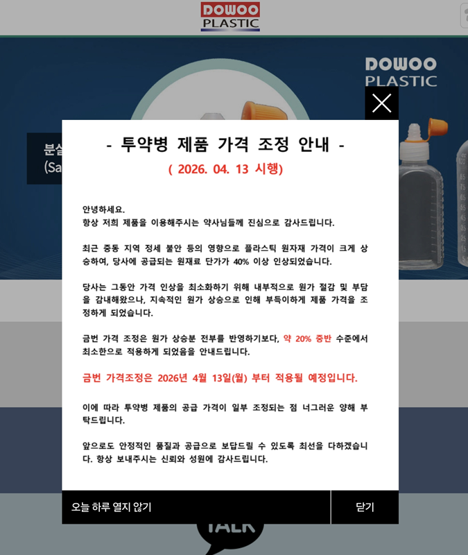 플라스틱 원자재 가격이 크게 상승해 공급 원재료 단가가 40% 이상 인상됐다는 것이다. 이 업체는 "원가 상승분 전부를 반영하기 보다 약 20% 중반 수준에서 최소한으로 인상을 조정할 방침"이라고 공지했다.