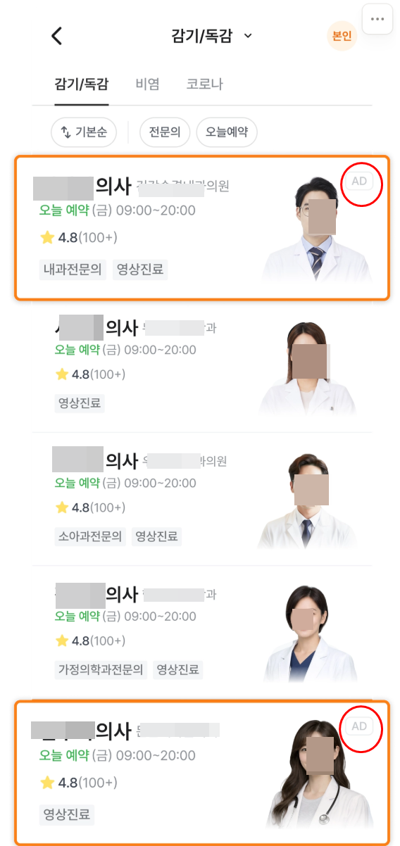 비대면진료 시 환자는 기본순, 거리순, 후기순 등의 정렬 기준으로 의사리스트를 볼 수 있다. 이번에 광고 상품으로 출시한 건 기본순으로 정렬 시 적용되는 상위 노출 서비스다.
