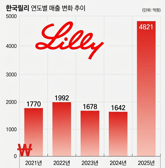 그간 릴리는 항암제 '버제니오(아베마시클립)', '사이람자(라무시루맙)'를 비롯해 SGLT-2 억제제 '자디앙(엠파글리플로진)', 생물학적제제 '탈츠(익세키주맙)' 등으로 안정적인 매출을 유지했지만, 2021~2024년까지는 2000억원대에 머무르며 정체 흐름을 보였다.