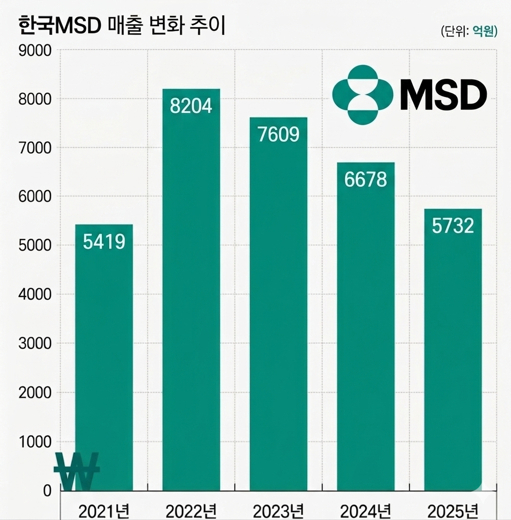 실제로 한국MSD의 매출은 코로나19 치료제 수요에 따라 큰 변동성을 보여왔다. 수요가 정점을 찍었던 2022년 매출은 8204억원으로 최대치를 기록했지만, 이후 엔데믹 전환과 함께 2023년 7609억원, 2024년 6678억원으로 감소했다. 지난해 매출 5732억원과 비교하면 3년 사이 매출은 30.1% 줄어든 셈이다.