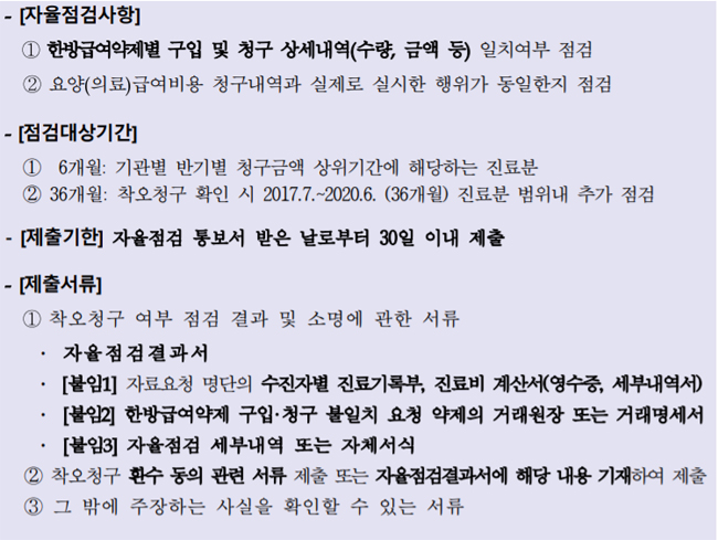 이번에 통보를 받은 요양기관은 한방급여약제별 구입 및 청구상세내역(수량, 금액 등) 일치했는지, 요양(의료)급여비용 청구내역과 실제로 실시한 행위가 동일한지 점검해 확인 결과를 자율적으로 신고하면 된다.
