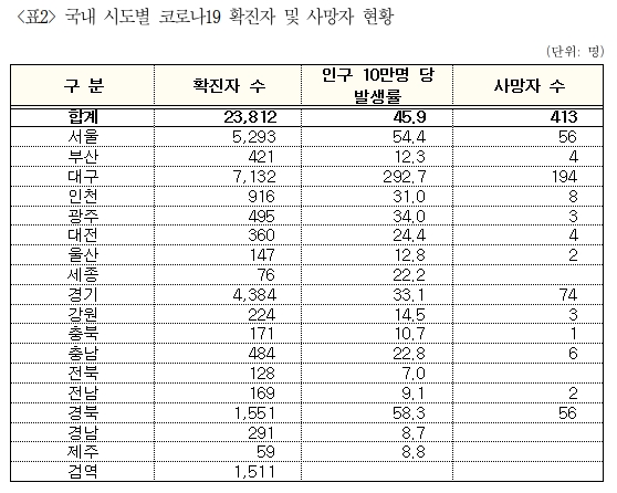 인구 10만명 당 코로나19 확진자 발생율을 보면 전국 평균은 45.9명으로 나타났으며, 시도별로는 대구시가 292.5명으로 가장 높았으며, 그 다음으로 경북 58.3명, 서울 54.4명, 광주 34.0명, 경기 33.1명, 인천 31.1명의 순으로 발생율이 높았다.
