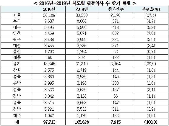 2016년 대비 2019년 활동 의사 수는 7,915명이 증가했으나, 이 중 74.8%인 5,920명의 의사들은 수도권, 부산, 대구 등 대도시에서 활동중이었다.