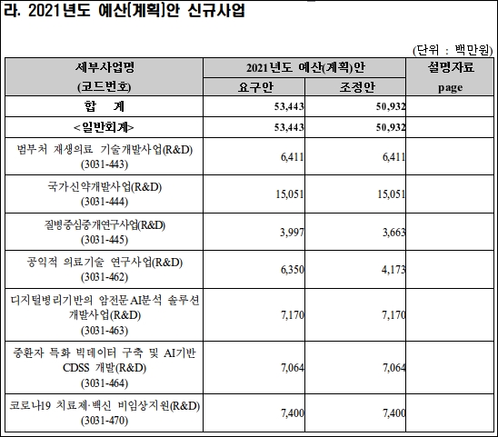이 중 내년에 신규 순증 예산으로 편성된 것은 ▲범부처 재생의료 기술개발사업(R&D) ▲국가신약개발사업 ▲질병중심중개연구사업(R&D) ▲공익적 의료기술 연구(R&D) ▲디지털 병리 기반의 암 전문 AI분석 솔루션 개발사업(R&D) ▲중환자 특화 빅데이터 구축 및 AI 기반 CDSS 개발(R&D) ▲다부처생명연구자원선진화사업 ▲코로나19 치료제·백신 비임상지원이다.