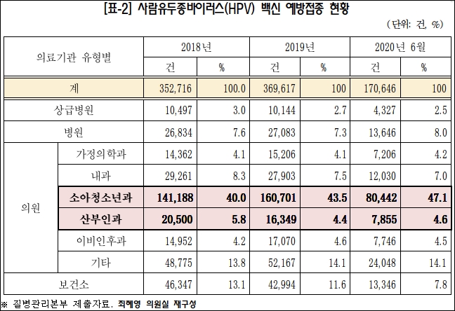 지난 3년간 매년 40% 이상의 여성 청소년이 산부인과가 아닌 소아청소년과에서 사람유두종바이러스(HPV) 백신 접종과 건강상담을 받았다는 것이다.