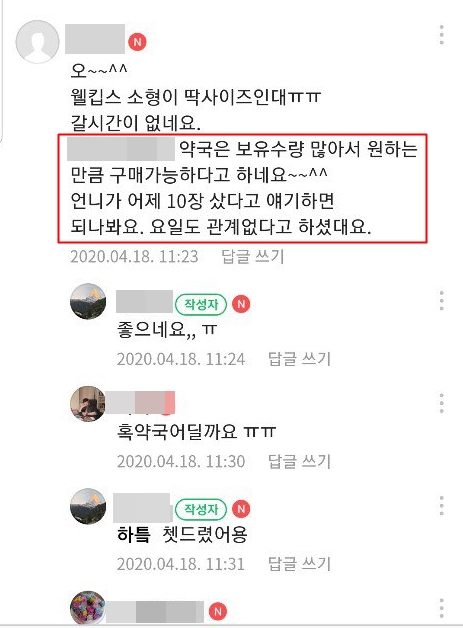 B약사는 "예전에는 여러 사람들이 약국에 몰려와 구입을 했기 때문에 판매지침을 자의반 타의반 지킬 수밖에 없었다"면서 "약국에 재고가 점점 쌓이고, 구입하러 오는 사람들도 띄엄띄엄오기 때문에 적당히 융통성을 발휘해서 판매를 하는 것"이라고 설명했다.