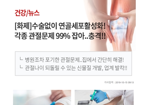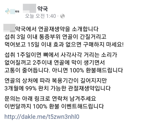 해당 페이지의 문구는 여느 건기식 허위과대광고 사례보다 더 노골적이었다. 게시글에는 00약국에서 연골재생약을 소개한다며 섭취 3일 이내 통증부위 연골이 간질거리고, 섭취 1주일이면 뼈에서 사각사각거리는 소리가 없어진다고 적었다.