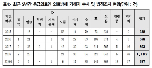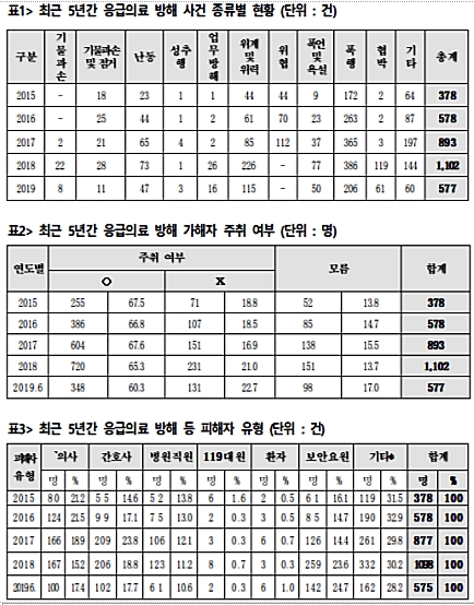 최근 5년간 응급의료 방해 사건은 총 3528건으로, 폭행사건의 경우 2015년 대비 2018년 2.9배 늘어났다.