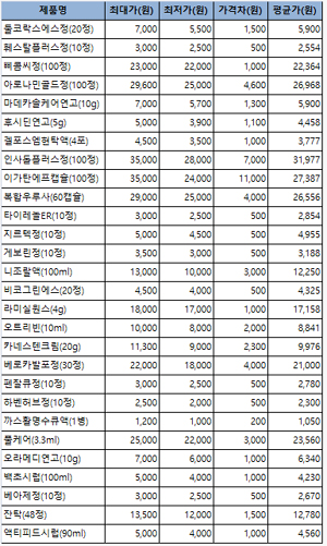 일반약 판매 1위인 아로나민골드(100정)는 최고 2만 9600원에서 최저 2만 5000원으로 1.2배의 편차를 보였다.