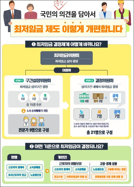 핵심은 구간설정위원회와 결정위원회로 결정 체계를 이원화하고 최저임금 결정기준을 추가·보완해 노동자 생활보장과 고용·경제 상황이 변수로 고려된다.