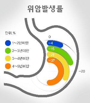 연구결과 아스피린 누적 사용 기간이 늘어날수록 위암 발병률이 감소하는 것으로 나타났다. 구체적으로 1~2년간 누적 사용한 경우 4%, 2~3년간 15%, 3~4년간 21%, 4~5년간 37%로 사용기간에 비례해 감소하는 결과를 보였다.
