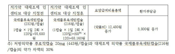 국제플루옥세틴캡슐의 경우 이번달부터 대체조제 인센티브 적용 대상이 됐다. 대상 지정 전에는 한 캡슐당 232원으로 1일 2회 120일 기준 약값은 5만5680원, 대상 지정 후에는 약가 인하도 적용돼 한 캡슐당 216원으로 1일 2회 120일 기준 약값은 6만8160원이 됐다.