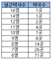 상근약사 11명을 신고한 약국은 4곳, 10명을 신고한 약국은 7곳, 9명 신고약국은 8곳이었다. 상근약사 8명 신고약국은 14곳, 7명 신고약국 26곳, 6명 신고약국 71곳 순이었다.