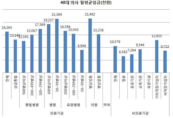 의사의 경우 병상수에 따라 격차가 컸다. 상급종합병원 의사는 1314만원을 받았지만 30~99병상 의료기관 의사는 2138만원의 월급을 받는 것으로 조사됐다.