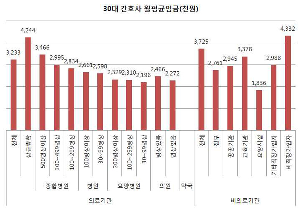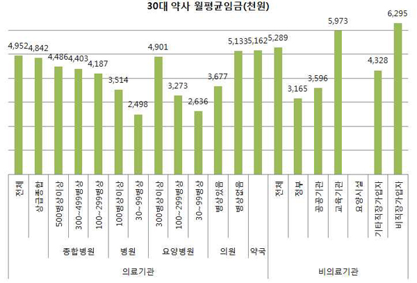 보건복지부가 최근 공개한 국민보건의료실태조사 보고서에 따르면 2016년 기준 활동 인력의 월 평균임금 수준을 의사 40대, 간호사 및 약사는 30대로 고정하고 근무기관 유형별로 분석했다.