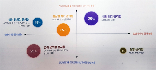 실제 소비자 조사 결과, 여러 소비자 유형 가운데 3040세대인 '꼼꼼한 자기 관리형' 집단이 전통적인 건기식 주 소비자층인 '가족 건강 관리형'과 함께 주요 타깃층으로 꼽혔다.