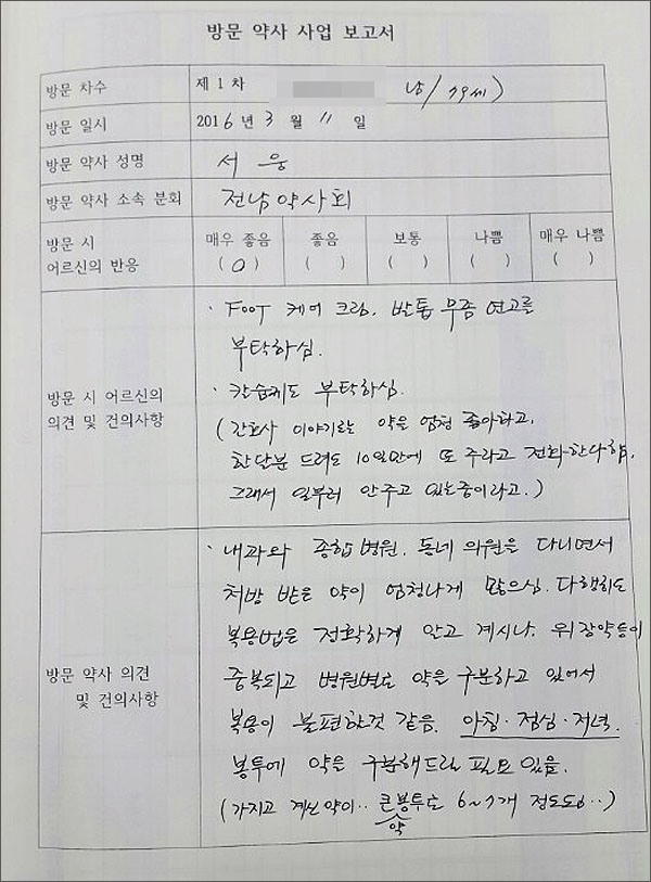전남시약사회 이숭령 여약사이사는 "전부터 몇몇 약사들이 뜻을 모아 독거노인 방문 약료를 진행했는데 지난해는 보건소와 MOU를 맺고 정식으로 사업을 진행하게 됐다"며 "보건소 관계자 방문간호사와 함께하다보니 평일 낮시간대만 가능해 나홀로약국 약사님은 참여를 못하는데 안타까워 하셨다. 그래서 따로 팀을 꾸리기도 했다"고 말했다.