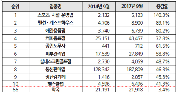 약국은 2104년 9월 기준 2만1191곳에서 2017년 9월 2만1918곳으로 3.4% 증가해 증감률 67위에 랭크돼 100대 업종의 평균 증가율 11.4%에 미치지 못했다.