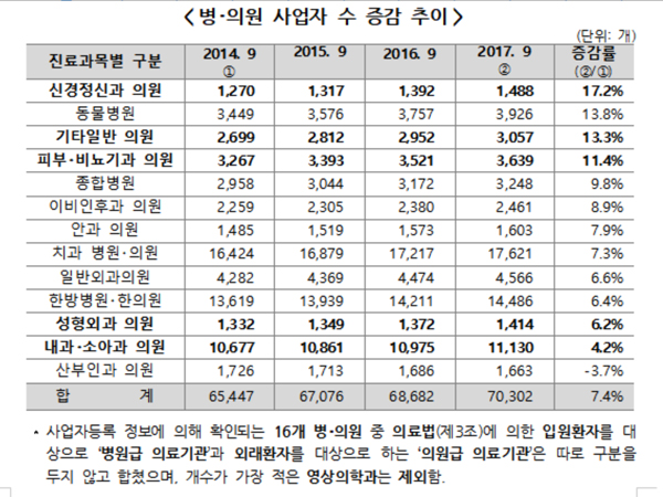 바쁜 현대 생활 등으로 신경성 질환이 많아지는 추세를 반영해 신경정신과(17.2%↑)는 병& 65381;의원 중 가장 높은 증가율을 기록했고 내과& 65381;소아과(4.2%↑), 성형외과(6.2%↑), 한방병원& 65381;한의원(6.4%↑)은 증가율이 상대적으로 낮았다.