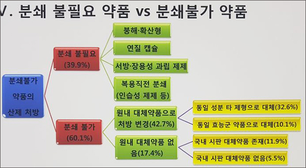 분쇄불가 약품의 산제처방은 크게 분쇄가 불필요한 약의 산제처방과 분쇄 불가 약의 산제 처방으로 분류했는데, 이중 분쇄가 불필요한 약의 산제처방은 39.9%를 차지했다. 여기에는 붕해 확산형과 연질캡슐, 서방·장용성 과립 제제, 복용직전 분쇄(인습성 제제 등) 등이 포함된다.