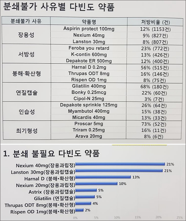 또 분쇄 불가 약의 산제처방은 60.1%를 차지했는데, 여기에는 원내 대체약품으로 처방이 변경 가능한 경우가 42.7%, 원내 대체약품이 없는 경우가 17.4%였다. 분쇄가 불필요한 약중 산제처방이 다빈도로 나오는 약 중에는 장용과립정인 넥시움 40mg과 란스톤 30mg이 각각 21%로 가장 빈도가 높았다.