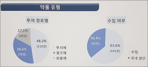 효능별로는 항균제가 15.3%로 가장 높은 비중을 차지했고, 혈액학적 제제(12.7%), 중추신경계 약물(11.4%), 항암제(11%), 면역학적제제/백신(8.8%), 자율신경계 약물(8.3%), 위장관계 약물(6.6%), 호르몬제제(5.7%) 순이었다.