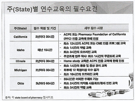 이 교수는 "미국의 주별 연수교육 필수요건을 보면 캘리포니아는 2년마다 30시간, 아이다호는 매년 15시간, 오하이오는 3년마다 60시간을 이수하도록 하고 있다"며 "연수교육 이수여부는 주 약학위원회에서 무작위 감사를 시행해 개별 약사에게 증거제출을 요구하고 있다"고 말했다.