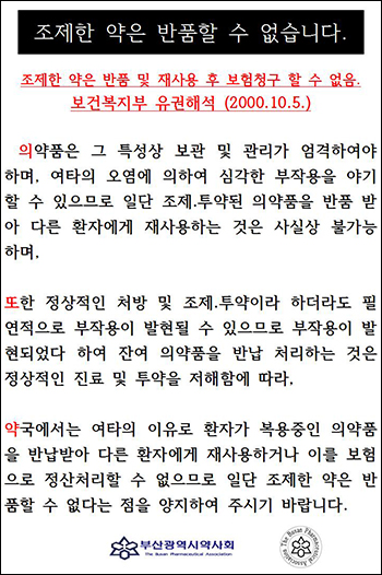 서울 강서구의 K약사는 "조제약 환불이 불가하다는 포스터를 게시했는데도 고객들과 얼굴을 붉혀야 하는 경우가 많다"며 "정부에서 조제약 환불이 불가하다는 정책 홍보를 하면 좋겠다"고 말했다.
