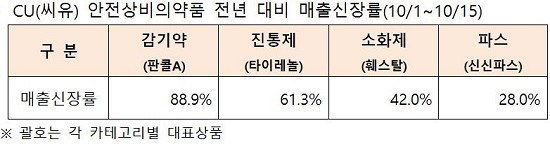 편의점 CU에 따르면 이번달 1일부터 15일까지 보름간 안전상비약 매출이 9월 대비 83.7%, 전년 동기간 대비 67% 크게 증가했다.