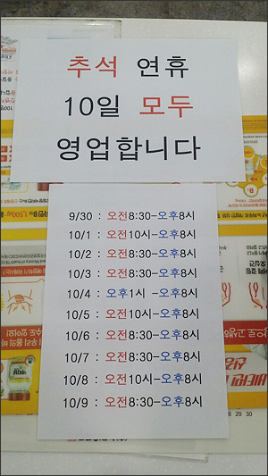 아산병원 앞 한 문전약국 약사는 "연휴 중 2일과 4일 정상영업을 할 예정"이라며 "명절 당일인 4일은 당번약국에 참여하기 위해서다. 몇 년째 추석 당일에 약국 문을 열고 있다"고 말했다.