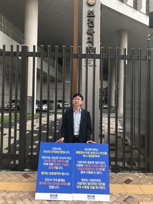 1인시위를 통해 의협은 제증명 수수료 제한 고시가 의료계와 충분한 협의 없이 진행돼 수용불가능 하다는 입장을 복지부에 전달했다.