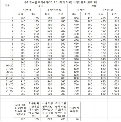 또 외용단독 처방은 투약일수에 상관 없이 4850원(야간 5960원) 소아 외용단독 처방은 5400원(야간 6670원)이다. 주사제 단독처방은 570원으로 인상된다.