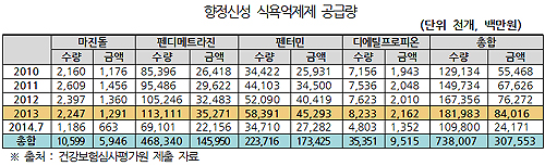 ±è ÀÇ¿øÀÌ ½É»çÆò°¡¿ø ÀǾàǰ°ü¸®Á¾ÇÕÁ¤º¸¼¾ÅͷκÎÅÍ Á¦Ãâ¹ÞÀº '¿ä¾ç±â°üÀ¸·Î °ø±ÞµÈ ½Ä¿å¾ïÁ¦Á¦ ÇöȲ'¿¡ µû¸£¸é ÇâÁ¤ ½Ä¿å¾ïÁ¦Á¦ °ø±Þ·®Àº 2010³â 1¾ï 2913Á¤, 2011³â 1¾ï4973Á¤, 2012³â 1¾ï6735¸¸Á¤, Áö³­ÇØ 1¾ï 8198¸¸ 3000Á¤À¸·Î, 4³â »õ ¹«·Á 40.9%³ª Áõ°¡ÇÑ °ÍÀ¸·Î ³ªÅ¸³µ´Ù.