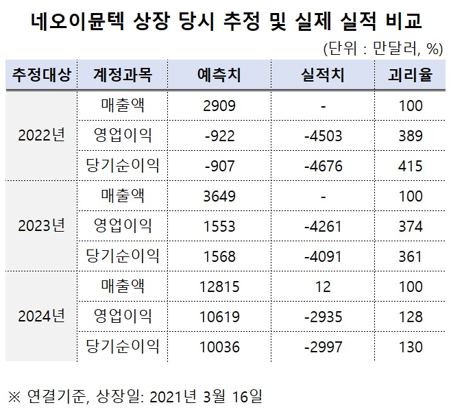 ±×·¯³ª ½ÇÁ¦ 2022³â ÀÌÈÄ ¸ÅÃâÀº »ç½Ç»ó ¹ß»ýÇÏÁö ¾Ê¾Ò°í ¿µ¾÷¼Õ½Ç°ú ¼ø¼Õ½Ç ±Ô¸ð´Â °¢°¢ ¿¹»óÄ¡º¸´Ù 3~4¹è ÀÌ»ó È®´ëµÆ´Ù. 2024³â¿¡´Â ¸ÅÃâÀÌ 12¸¸´Þ·¯¿¡ ±×Ä¡¸ç ¿¹ÃøÄ¡ÀÇ 1000ºÐÀÇ 1 ¼öÁØ¿¡ ºÒ°úÇß´Ù. ³×¿ÀÀ̹ÃÅØÀº 2021³â ±â¼úƯ·Ê·Î »óÀåÇÑ ¾÷ü Áß IPO °úÁ¤¿¡¼­ ¿¹ÃøÇÑ ÃßÁ¤ ¼øÀÌÀͰú ½ÇÁ¦ ¼øÀÌÀÍ °£ Â÷À̰¡ °¡Àå Å« °÷À¸·Î ²ÅÈù´Ù.