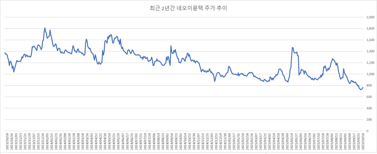 ÆÄÀÌÇÁ¶óÀÎ ¼º°ú Áö¿¬°ú ½ÇÀû ºÎÁø, À繫 ¸®½ºÅ© µîÀÌ °ãÄ¡¸é¼­ ÁÖ°¡µµ ±Þ¶ôÇÑ »óÅ´Ù. IPO ¶§ ³×¿ÀÀ̹ÃÅØ °ø¸ð°¡´Â 7500¿øÀ̾ú´Âµ¥ »óÀå ÀÌÈÄ Áö¼ÓÇØ¼­ ÁÖ°¡°¡ Ç϶ôÇØ ÇöÀç ÁÖ°¡´Â 700¿øÀ» ¹Øµ¹°í ÀÖ´Ù. ³×¿ÀÀ̹ÃÅØ ÁÖ°¡´Â ¿Ã »ó¹Ý±â À¯»óÁõÀÚ °áÁ¤ ÀÌÈÄ ¾à¼¼¸¦ À̾î¿ÔÀ¸¸ç À̹ø ´ëÇ¥ »çÀÓ ¼Ò½Ä¿¡ ´Ù½Ã ÇÑ ¹ø Ç϶ô ¾Ð·ÂÀ» ¹Þ°í ÀÖ´Ù. 13ÀÏ ³×¿ÀÀ̹ÃÅØÀº 662¿øÀ¸·Î ÀåÀ» ¸¶°¨Çß´Ù.
