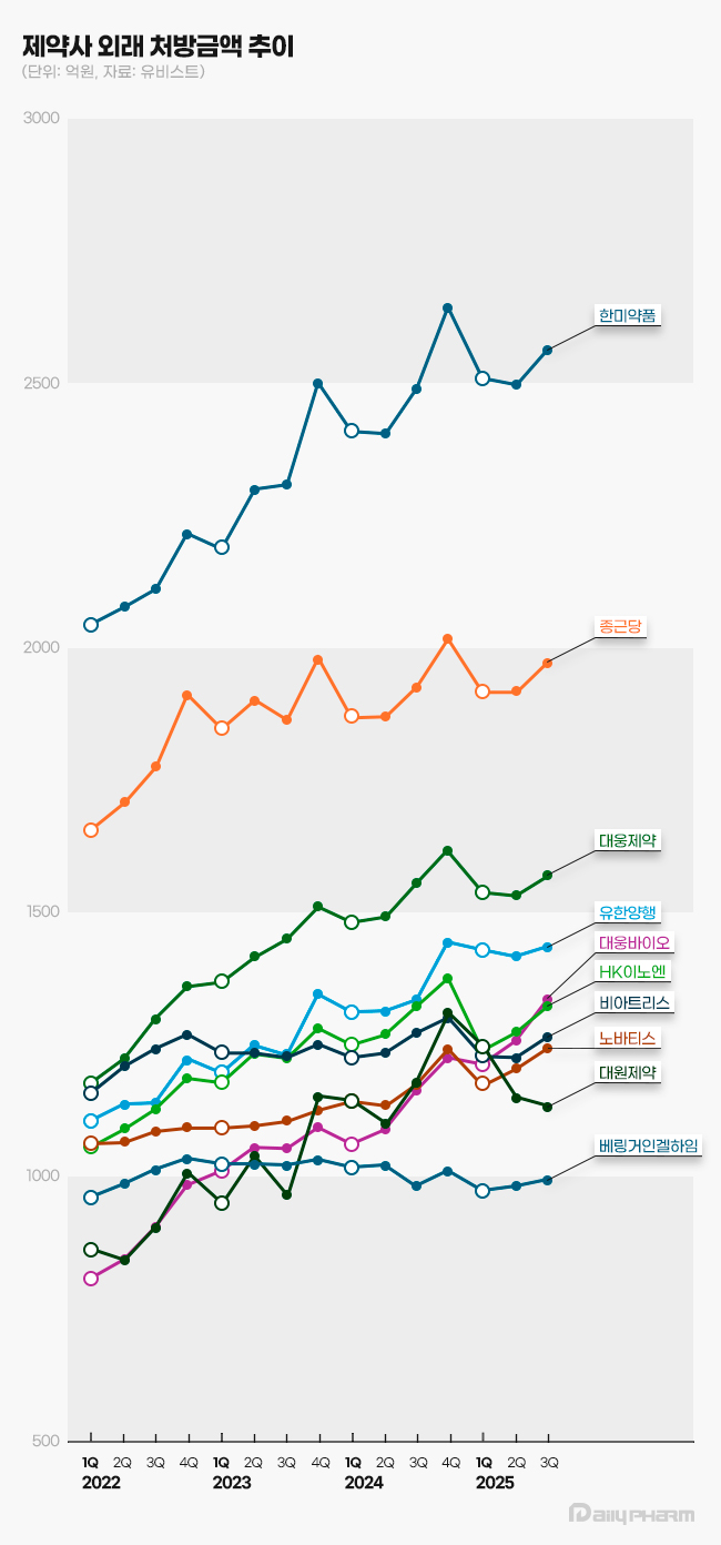 ÁÖ¿ä Á¦¾à»ç Áß HKÀ̳뿣, ºñ¾ÆÆ®¸®½º, ´ë¿øÁ¦¾à µîÀÇ 3ºÐ±â 󹿾×ÀÌ Àü³â´ëºñ ¼ÒÆø °¨¼ÒÇß´Ù. ³ë¹ÙƼ½º´Â ÀÛ³â 3ºÐ±âº¸´Ù ¿Ü·¡ ó¹æ±Ý¾×ÀÌ 6.2% Áõ°¡Çß´Ù.