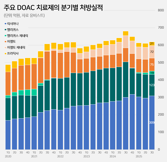 [µ¥Àϸ®ÆÊ=±èÁø±¸ ±âÀÚ] Á÷Á¢ÀÛ¿ë °æ±¸¿ë Ç×ÀÀ°íÁ¦(DOAC, Direct Oral Anti-Coagulant) ½ÃÀå¿¡¼­ ¡®¿¤¸®Äû½º(¾ÆÇÈ»ç¹Ý)¡¯ Á¦³×¸¯ÀÌ ÀçÁøÀÔ 1³â ¸¸¿¡ Á¡À¯À²À» 13%·Î È®´ëÇß´Ù. ½ÃÀå¿¡¼­ ö¼öÇϱâ Á÷ÀüÀÇ Ã³¹æ½ÇÀû Á¡À¯À²°ú ºñ±³Çϸé Àý¹Ý ¼öÁØ¿¡ ±×Ä£´Ù.