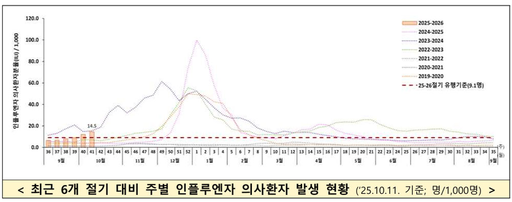 Áúº´°ü¸®Ã»¿¡ µû¸£¸é 41ÁÖ(10¿ù 5~11ÀÏ) ÀÎÇ÷翣ÀÚ ÀǽÉÁõ»óÀ» º¸ÀÌ´Â ÀÇ»çȯÀÚ¼ö´Â 1000¸í´ç 14.5¸íÀ¸·Î À¯Çà±âÁØÀÎ 9.1¸íÀ» ÇÑÂü ³Ñ¾î¼¹´Ù.