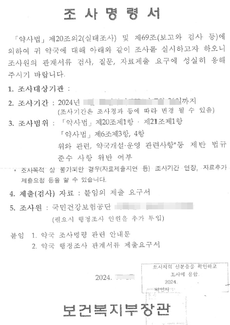 [2024.5.20]À§µåÆÊ °¡¸Í¾à±¹¿¡ ´ëÇÑ Á¶»ç°¡ ½ÃÀ۵ƴÙ. °ø´Ü ÇàÁ¤Á¶»çÆÀÀº 4Â÷·Ê¿¡ À§µåÆÊ °¡¸Í¾à±¹¿¡ ´ëÇÑ Àü¼öÁ¶»ç¸¦ ÁøÇàÇß´Ù. »çÀü Å뺸´Â ¾ø¾úÀ¸¸ç Á¶»ç¿øµéÀº Á¶»ç¸í·É¼­¿Í ¾È³»¹®, 21°³ Ç׸ñ ¼­·ùÁ¦Ãâ¿ä±¸¼­¸¦ Á¦½ÃÇß´Ù.