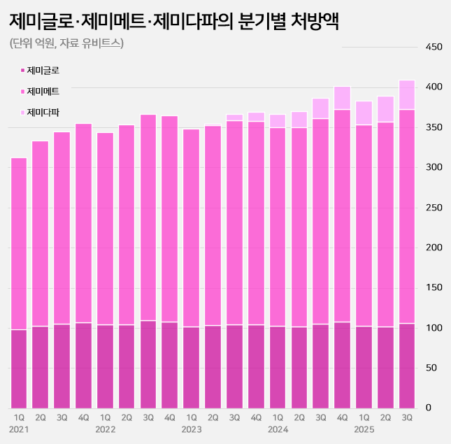 ÀǾàǰ ½ÃÀåÁ¶»ç±â°ü À¯ºñ½ºÆ®¿¡ µû¸£¸é Á¦¹Ì±Û·Î¡¤Á¦¹Ì¸ÞÆ®´Â DPP-4 ¾ïÁ¦Á¦ °è¿­ ´ç´¢º´ Ä¡·áÁ¦ ½ÃÀå¿¡¼­ °¡Àå ³ôÀº 󹿽ÇÀûÀ» ±â·Ï ÁßÀÌ´Ù. Áö³­ÇØ µÎ Á¦Ç°ÀÇ ÇÕ»ê 󹿾×Àº 1434¾ï¿øÀÌ´Ù. 2023³â ¹ß¸ÅµÈ ´ÙÆÄ±Û¸®Ç÷ÎÁø º¹ÇÕÁ¦ Á¦¹Ì´ÙÆÄ 󹿾×À» ´õÇϸé 1525¾ï¿ø¿¡ ´ÞÇÑ´Ù.