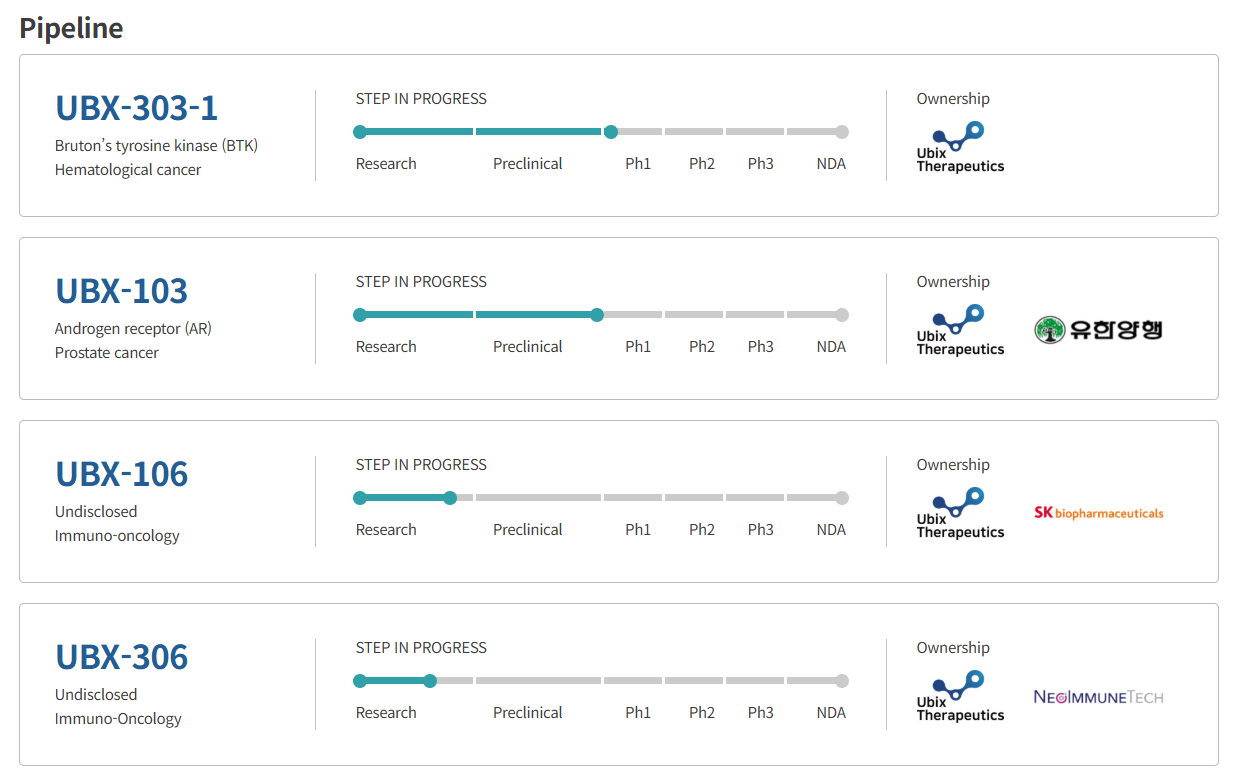 À¯ºò½ºÅ×¶óǻƽ½ºÀÇ ÇÙ½É ±â¼úÀº ÀÚü°³¹ß TPD Ç÷§Æû µð±×·¡µà¼­´Ù. À¯ºñÄûƾ-ÇÁ·ÎÅ×¾ÆÁ» °æ·Î¸¦ Ȱ¿ëÇØ Ç¥Àû ´Ü¹éÁúÀ» ºÐÇØÇÏ´Â ¹æ½ÄÀ¸·Î, Áúº´ À¯¹ß ´Ü¹éÁúÀ» ¼±ÅÃÀûÀ¸·Î ºÐÇØÇÏ´Â ºÐÀÚ¸¦ ¼³°è¡¤°³¹ßÇÒ ¼ö ÀÖ°Ô ÇØÁÖ´Â ±â¹Ý ±â¼úÀÌ´Ù. ȸ»ç´Â ÀÌ Ç÷§ÆûÀ» ±â¹ÝÀ¸·Î UBX-103À» Æ÷ÇÔÇØ ¡ãBTK ÀúÇØÁ¦ Èĺ¸¹°Áú UBX-303-1 ¡ã¸é¿ªÇ×¾ÏÁ¦ Èĺ¸¹°Áú UBX-106 ¡ã¸é¿ªÇ×¾ÏÁ¦ Èĺ¸¹°Áú UBX-306 µîÀ» °³¹ß ÁßÀÌ´Ù.